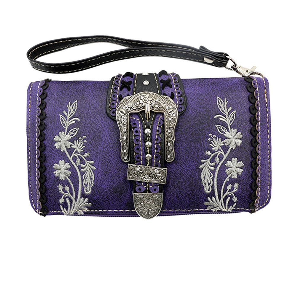 Multi Functional Western Buckle Embroidery Trifold Clutch Crossbody Wallet